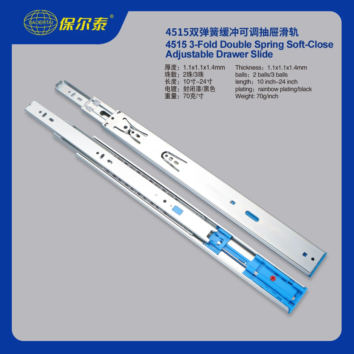 45 毫米软闭合可调节抽屉滑轨 批发双弹簧安装导轨